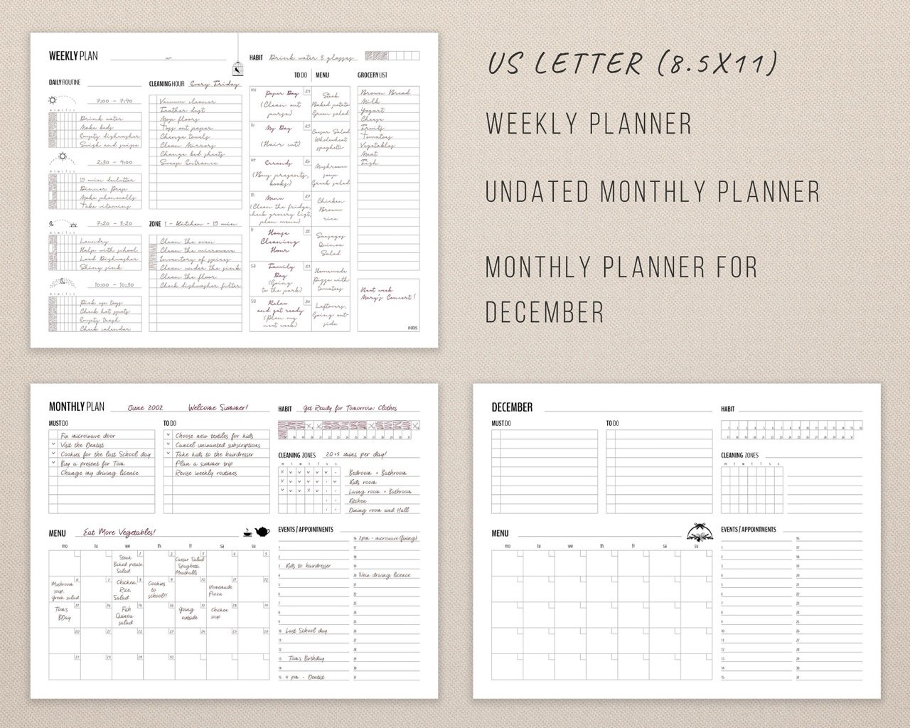 Daily and Weekly Routine Checklist, House Cleaning Hour, Zone Cleaning Planner, Notes Pack and To-Do Lists, 2 Weekly Menu Plans and Monthly Plan - these templates can be also used by Flylady's cleaning system followers (flylady.net). The printables are perfect for any US Letter (8,5 x 11 in) Binder or Planner with rings.
