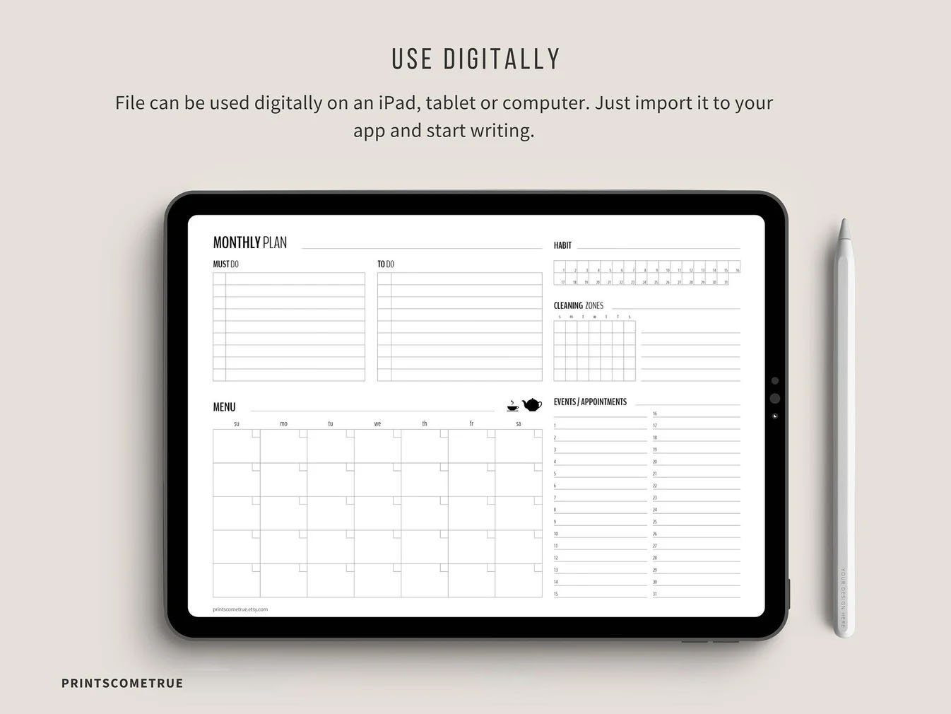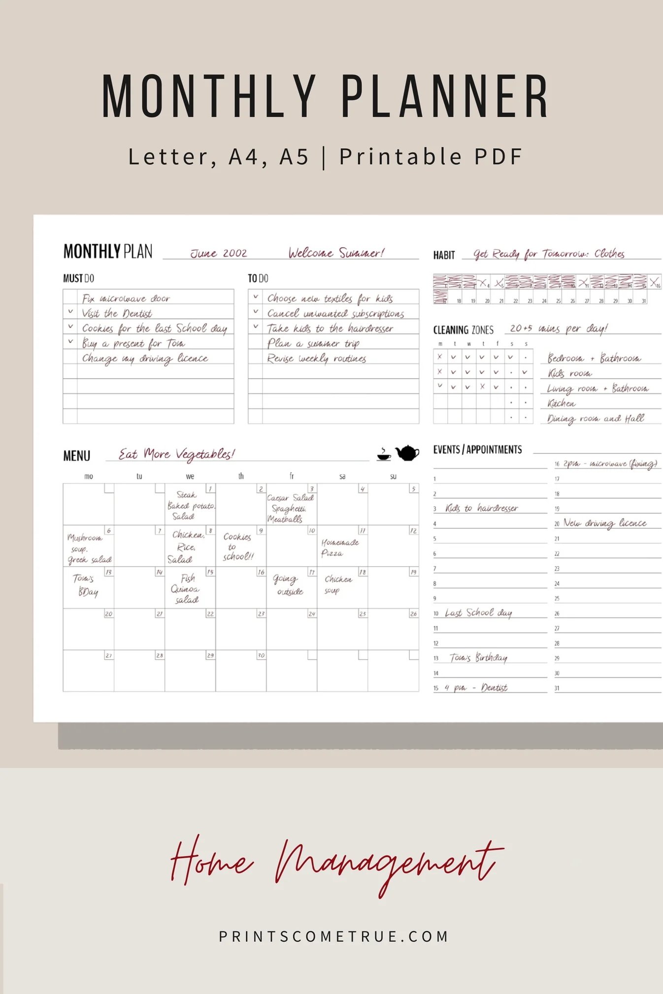 Use the habit tracker to keep track of your main monthly habit, and use the cleaning zones list to remind you what needs to be done daily in your house. A Monthly Menu will help you stay organized with your monthly meal planning.