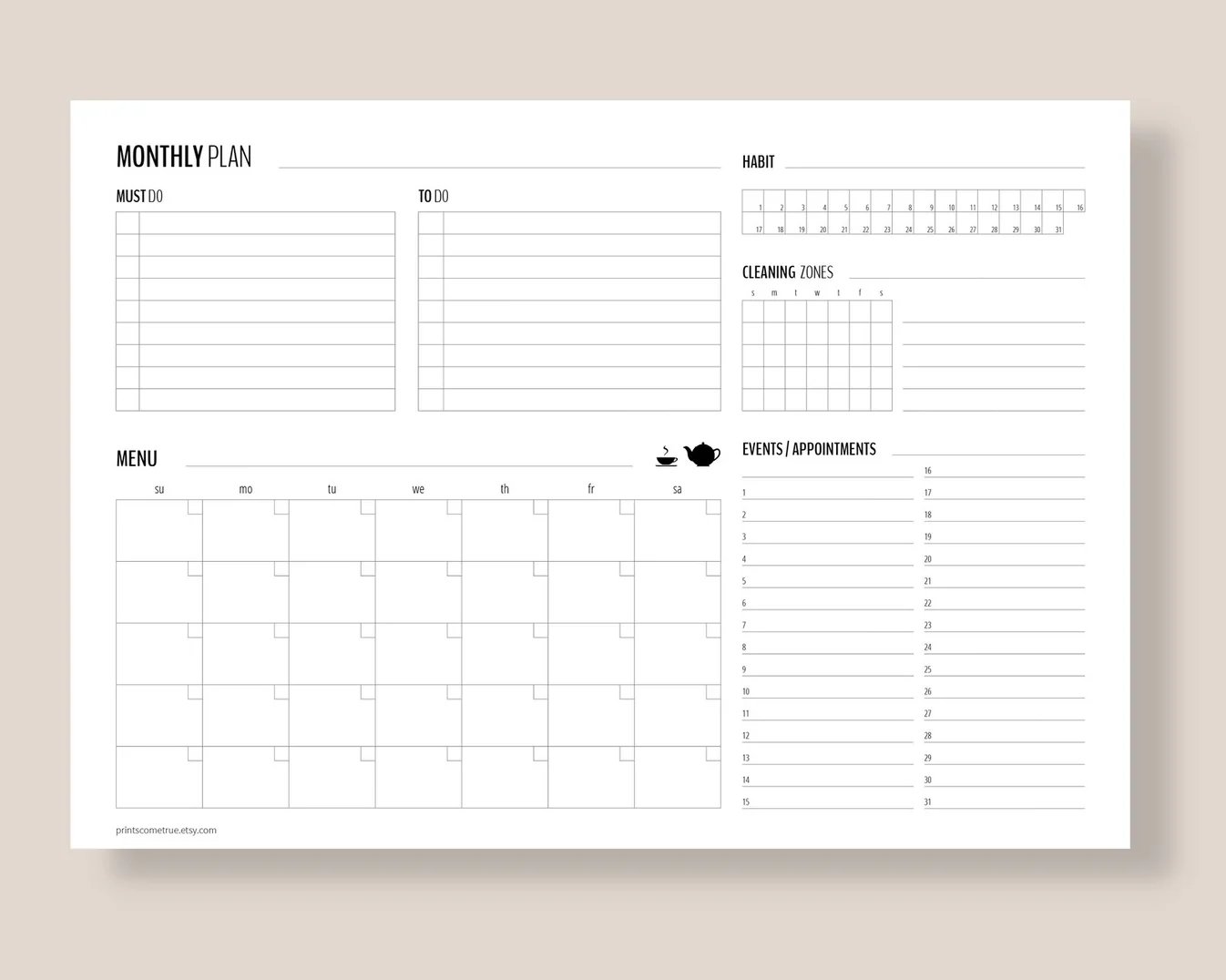 This Monthly Planner will help you to plan your month and stay on track. It can be used by Flylady's cleaning system followers (flylady.net). This simple checklist is created to make it easier to remember everything that needs to be done (Must-do, To-do, Main events/Appointments, Habit tracker, Zone cleaning, Monthly Menu).