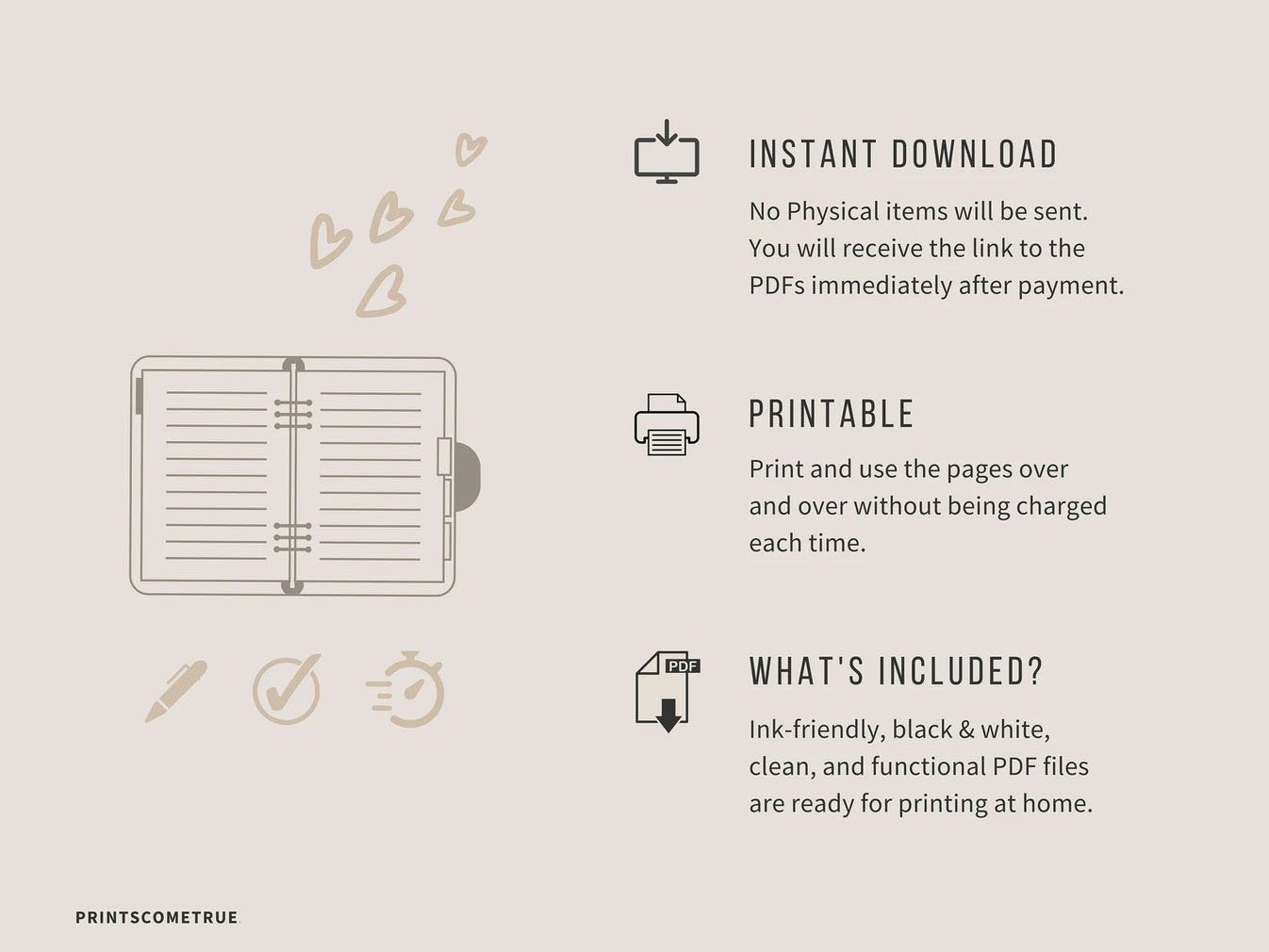 The printable is minimalist and clean, with no distractions — no colors or extra graphics. It's just you and your plans! It's printable and easy to use; it can be easily printed on any printer and is perfect for any Letter/A4 Binder or Planner with rings.