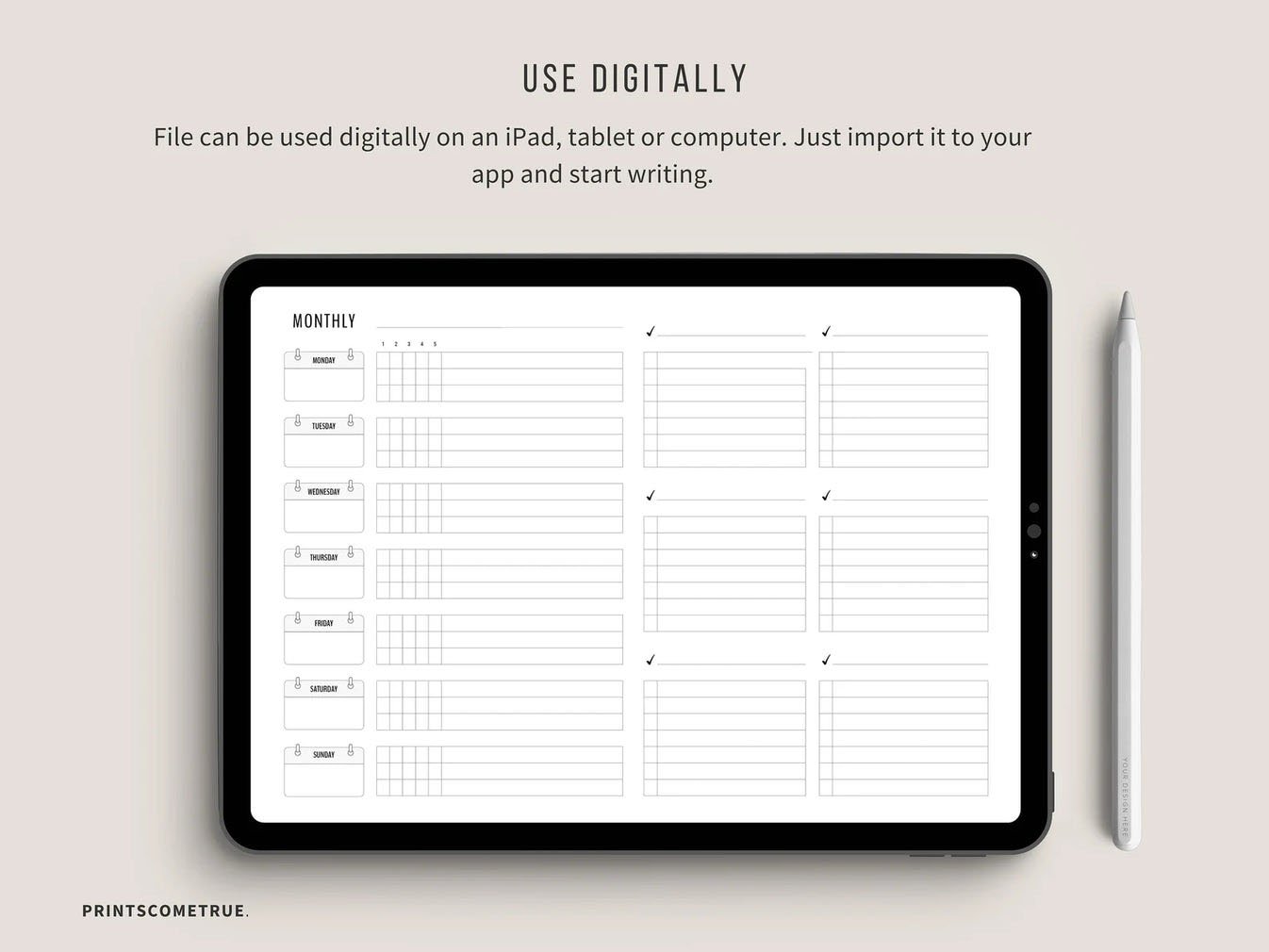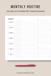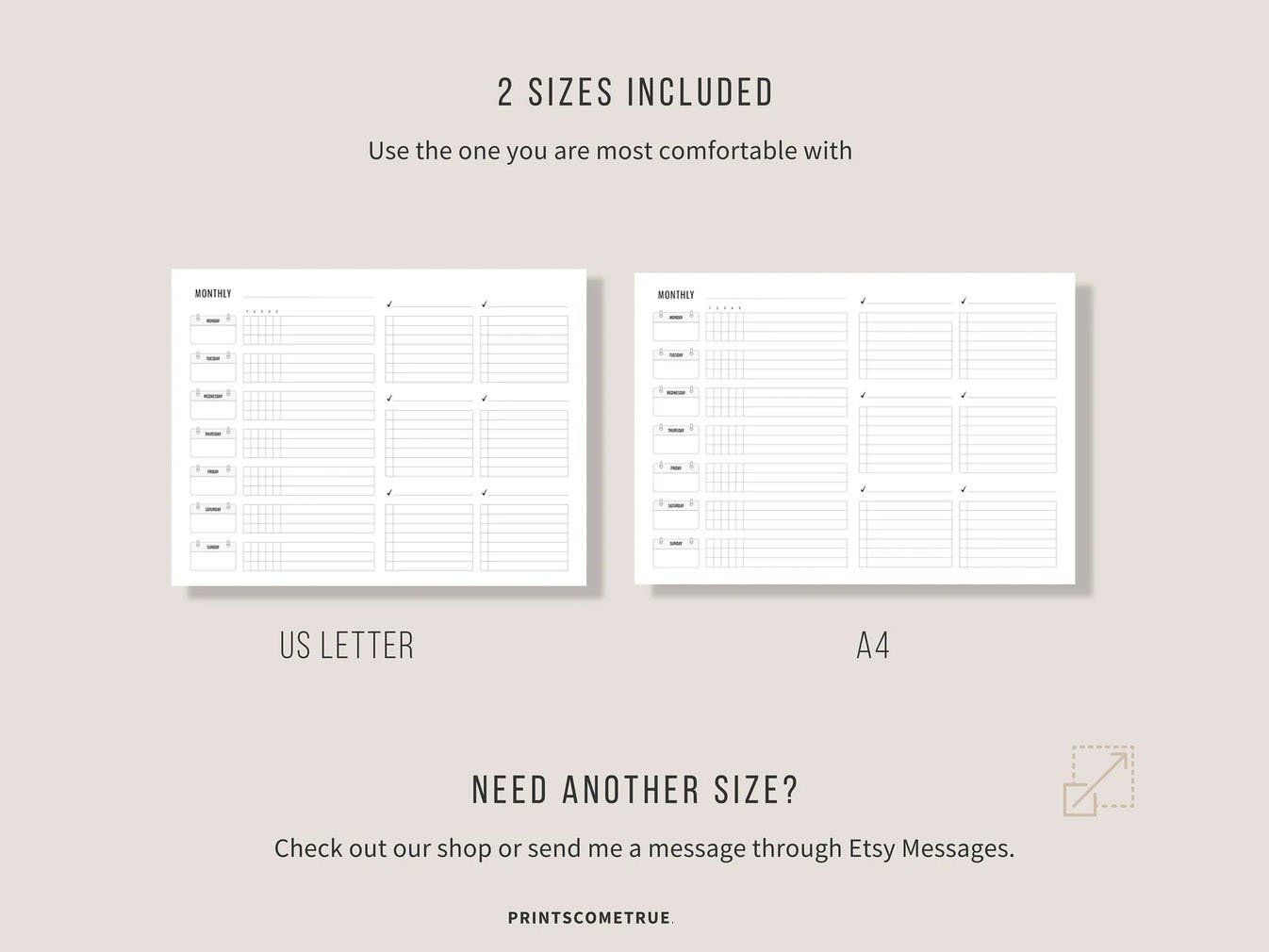 A Weekly routine on the left side of the layout will outline the activities and tasks you intend to accomplish every week in a month. Categorized task blocks on the right side will map your cleaning goals for the month ahead. Don't let another week slip by without a plan!