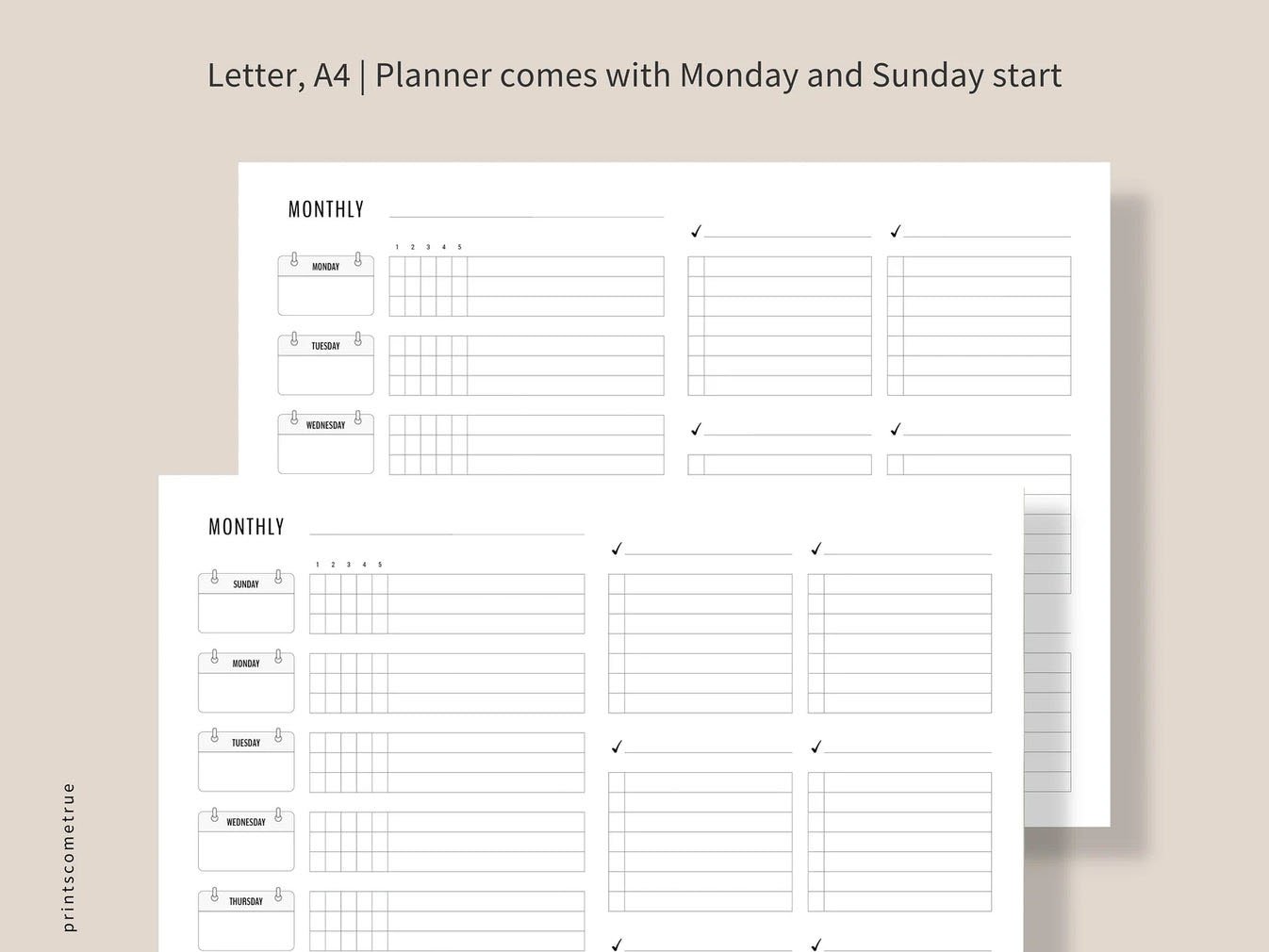 ≕ 4 PDF files include Monthly Planners starting from Monday and Sunday≔
