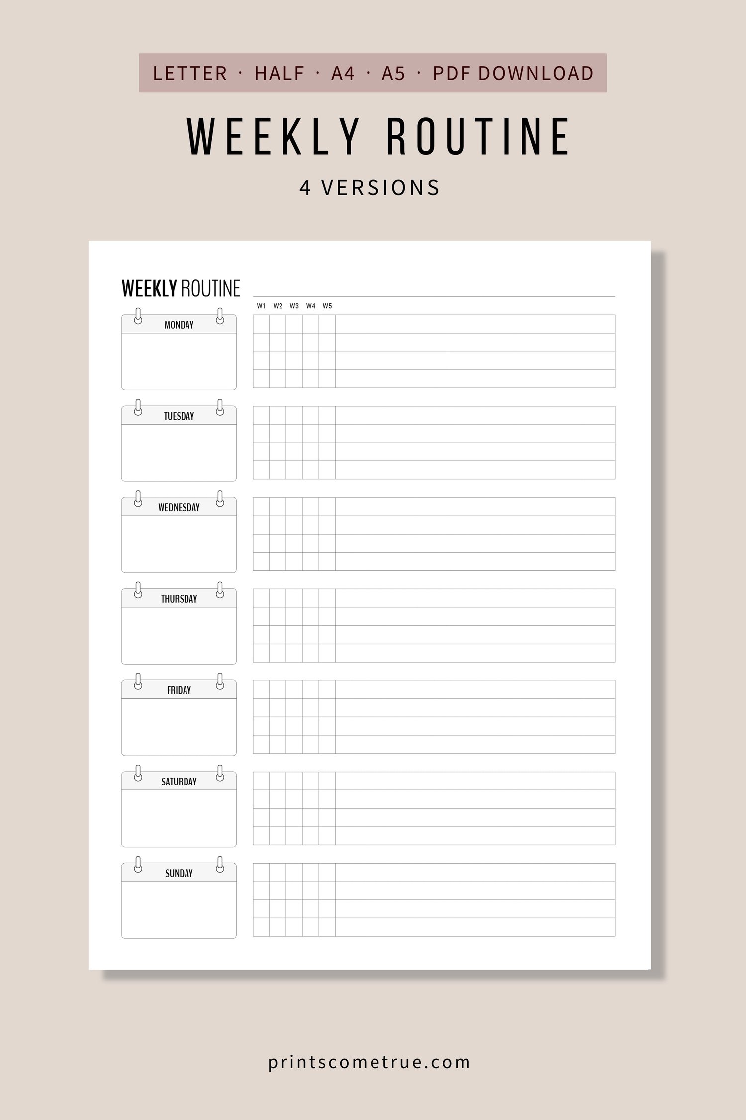 2. Weekly Routine Checklist with checkboxes for 5 weeks (one month)